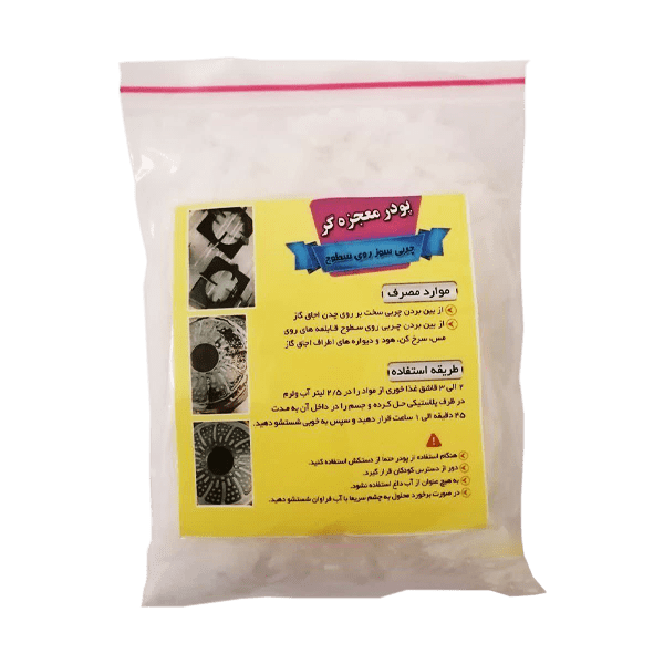 پودر معجزه گر برای از بین بردن چربی روی چدن گاز، انواع ظروف مسی و روحی، سرخ کن، هود، دیواره های اطراف گاز و همچنین چربی روی موتور ماشین استفاده می شود.