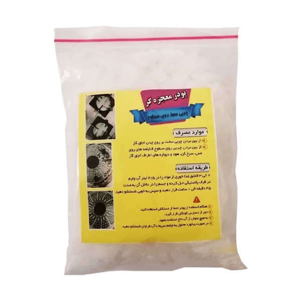 پودر معجزه گر برای از بین بردن چربی روی چدن گاز، انواع ظروف مسی و روحی، سرخ کن، هود، دیواره های اطراف گاز و همچنین چربی روی موتور ماشین استفاده می شود.